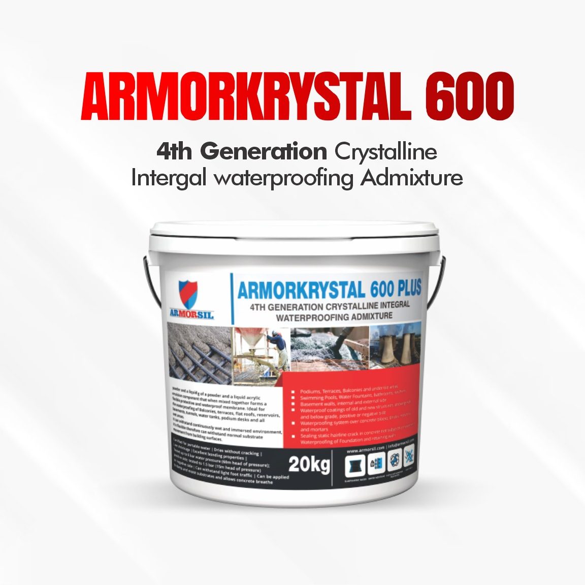ARMOKRYSTAL 600 PLUS – is a 4th generation powder crystalline Integral waterproofing admixture designed to resist hydrostatic pressure and for all concrete requiring primary waterproofing. The innovative crystalline technology within ARMORKRYSTAL